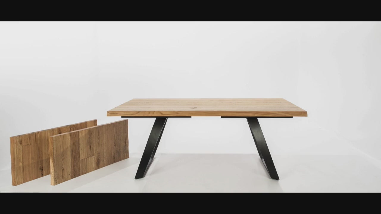 Mesa de comedor con dos extensiones exteriores: el aspecto distintivo, que recuerda a una tabla rugosa, se enfatiza mediante el diseño de los bordes.